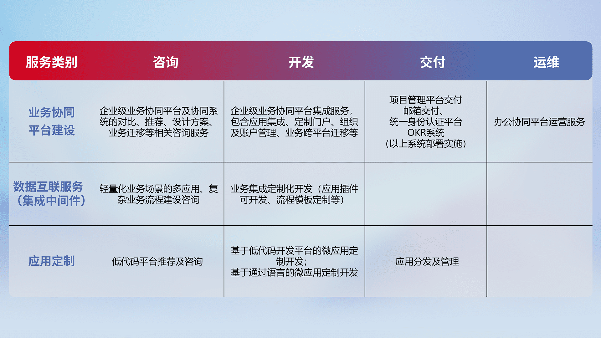 针对钉钉、、、、企微、、、IDaas等平台级产品提供产品的规划、、、、方案、、、、交付、、、、定制化开发等服务,,,实现如统一协同办公、、智能客户服务、、、混合会议管理、、智能数据查询、、、、等业务场景,,实现数字化转型。。。。
